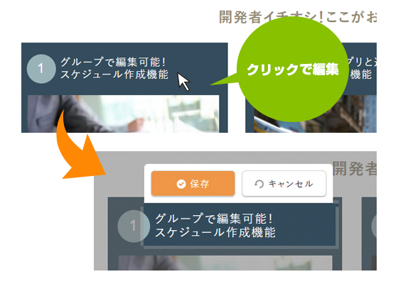 各ページの編集や削除、サイト公開などCMSの標準機能をスマホアプリに搭載!外出先でもホームページを編集することができます。